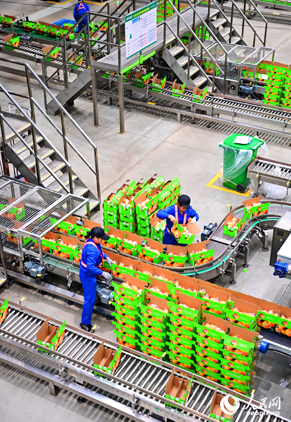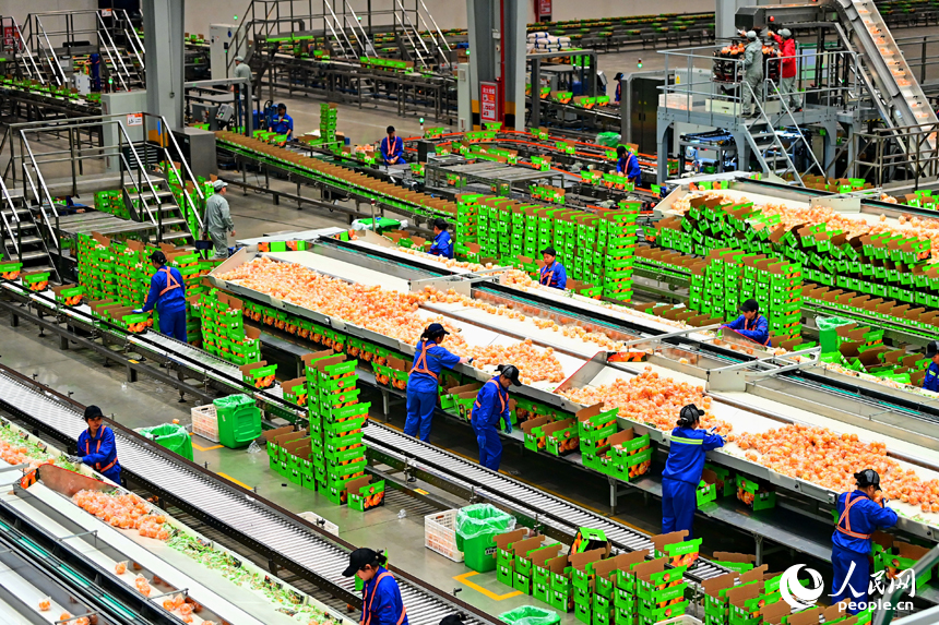 Employees were screening and packaging fresh navel oranges on the "5G plus industrial internet" sorting and packaging production line at the “smart” workshop of a navel orange processing company in the high-tech industrial park of Xinfeng county, Ganzhou city, east China's Jiangxi Province on Nov. 25.