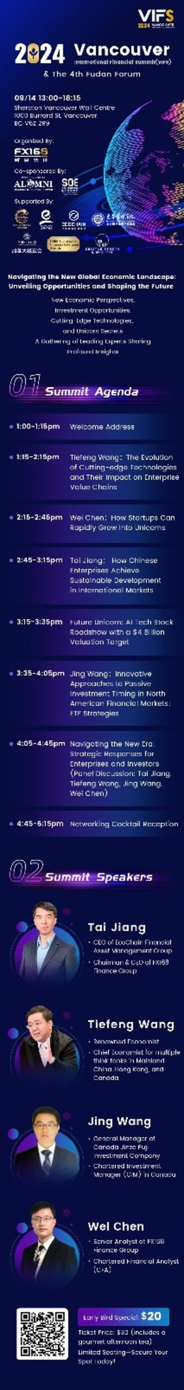 We are honored to welcome distinguished speakers,including the Chairman and CEO of FX168 Finance Group,Tai Jiang; renowned economist,Tiefeng Wang; General Manager of Jinze Puzhi Investment Canada,Jing Wang; and Senior Analyst at FX168 Finance,Wei Chen. Together,they will offer expert analysis on global economic trajectories,groundbreaking technological advancements,and the latest developments in capital markets. Their insights will provide you with a comprehensive understanding of the global market and help you capture emerging investment opportunities.