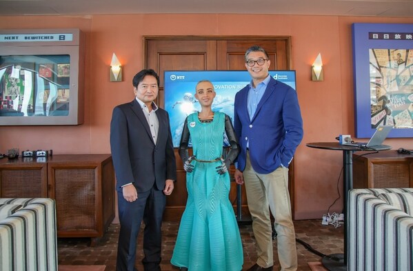 The photo features Taichi Hiramatsu,NTT Com Asia (left),Sophia,the social humanoid (middle),and Stephen Tsang,Chief Revenue Officer,NTT Com Asia (right).