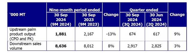Fruit yield for the period decreased year-on-year from 14.4 tonnes per hectare in 2023 to 12.8 tonnes per hectare,as a result of land preparation for replanting and the impact of El Niño conditions in late 2023.While palm product output remains below last year's levels,it has recovered consistently each quarter and GAR expects the peak crop season to shift to the fourth quarter this year.
