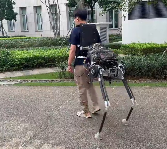 The team behind the robot,led by Zhixin Tu,Yihao Jiang,and Chenglong Fu,write: ‘The Centaur robot comprises two independent three-DoF robotic legs and a robotic torso,coupled with the human via a passive softening elastic mechanism,forming a human-Centaur quadruped system.
