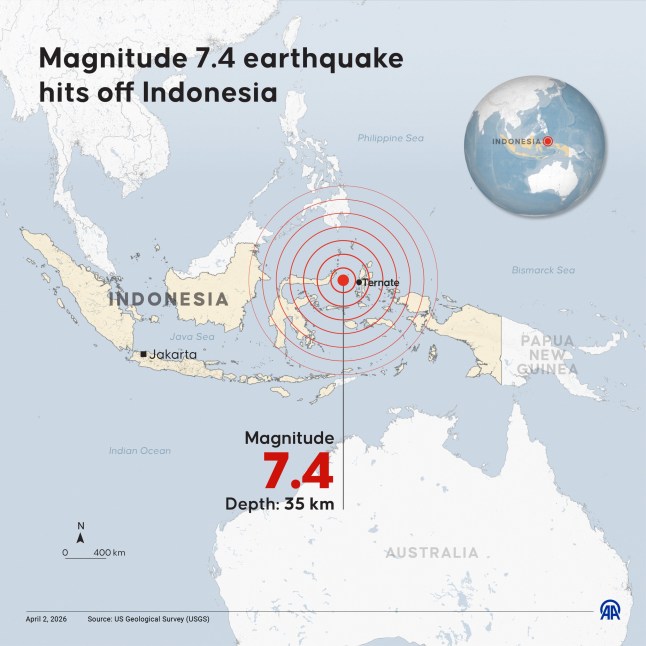 One person has died after a major earthquake struck off the coast of Indonesia this morning. The 7.4-magnitude quake in the Molucca Sea between the Sulawesi and Maluku island groups sent people fleein